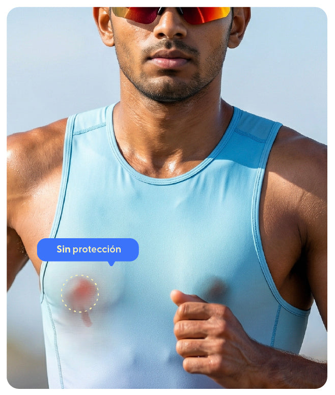Sabemos que en tus fondos de fin de semana solías usar cinta médica (micropore) o vaselina. El problema es que el clima húmedo y la fricción constante hacen que estas soluciones caseras se despeguen antes del kilómetro 10, causando el temido "pezón de corredor" (sangrado por roce).